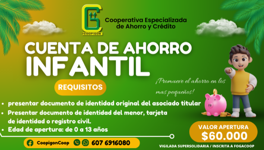 Se considera como ahorro INFANTIL a la captación de dinero proveniente de personas naturales menores de 14 años, a los cuales se les reconoce intereses sobre el saldo mínimo promedio diario a la tasa de interés fijada por la administración.
